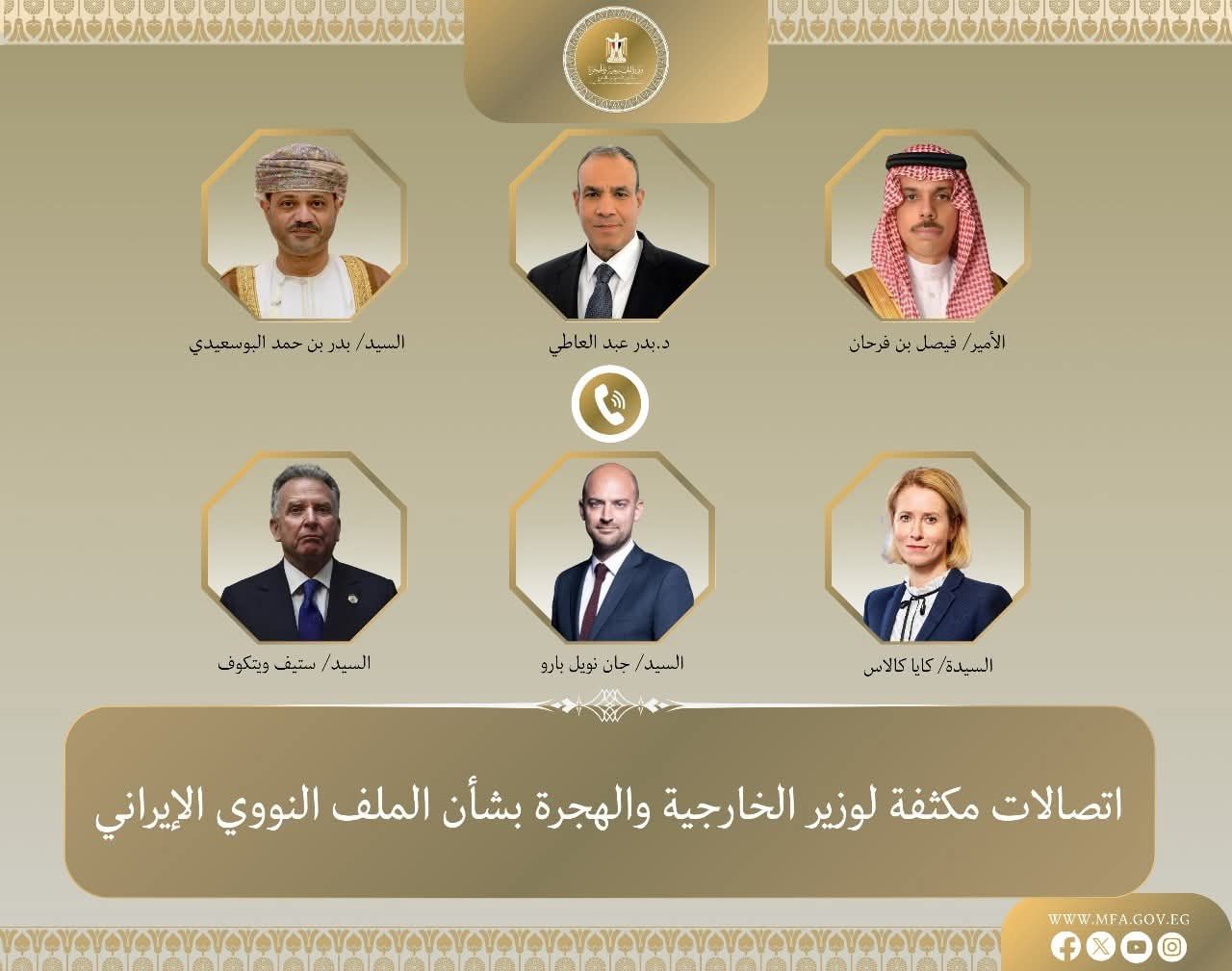 جرت اتصالات هاتفية بين د. بدر عبد العاطى وزير الخارجية والهجرة وشئون المصريين بالخارج مع كل من السيدة “كايا كالاس” الممثلة العليا للشئون الخارجية والسياسة الأمنية للاتحاد الأوروبى، والسيد “جان نويل بارو” وزير خارجية فرنسا، وسمو الأمير فيصل بن فرحان وزير خارجية المملكة العربية السعودية، والسيد بدر بن حمد البوسعيدي وزير خارجية سلطنة عُمان، والسيد “ستيف ويتكوف” المبعوث الأمريكي الخاص للشرق الأوسط، وذلك فى اطار متابعة توجيهات السيد رئيس الجمهورية بمواصلة التنسيق والتشاور مع الأطراف الإقليمية والدولية بشأن تطورات الملف النووى الايرانى.