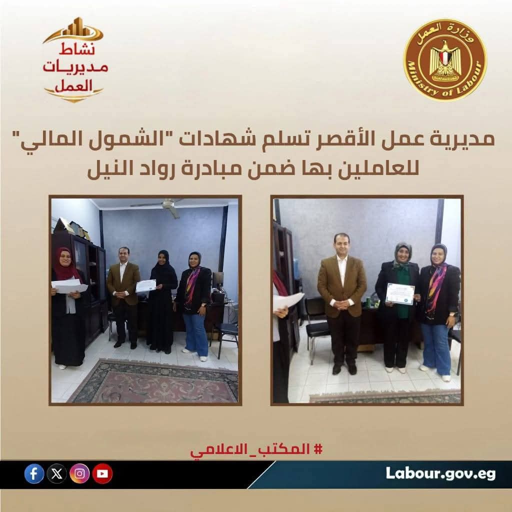 16- مديرية عمل الأقصر تسلم شهادات “الشمول المالي” للعاملين بها ضمن مبادرة رواد النيل