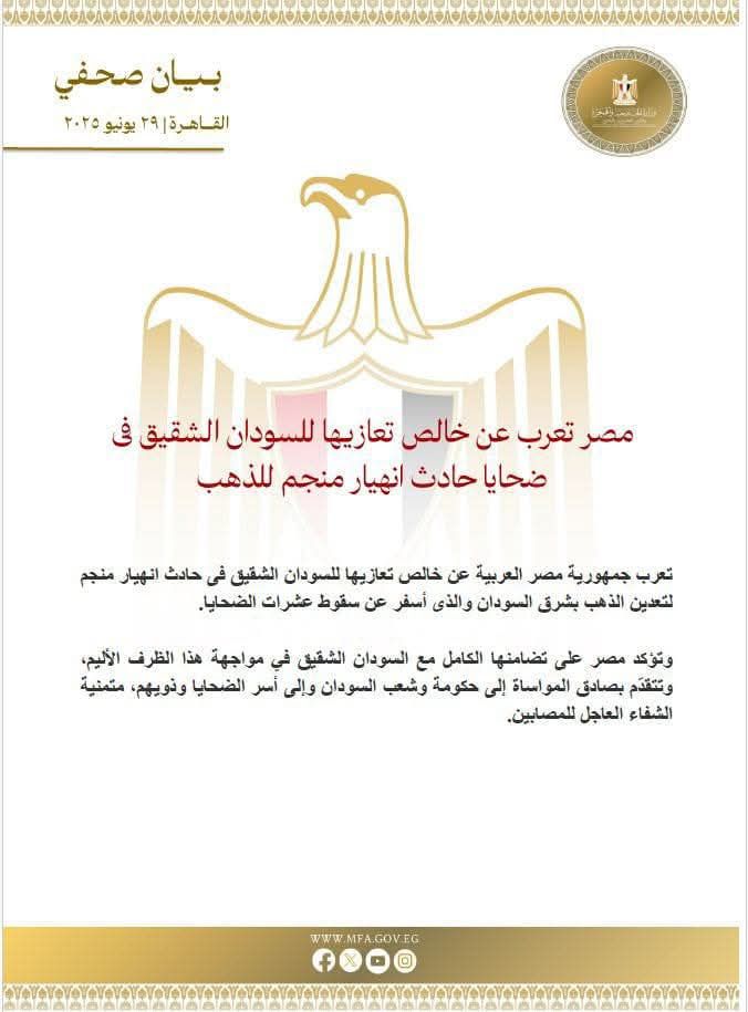 🔳 مصر تعرب عن خالص تعازيها للسودان الشقيق فى ضحايا حادث انهيار منجم للذهب.................................................................بيان صادر…