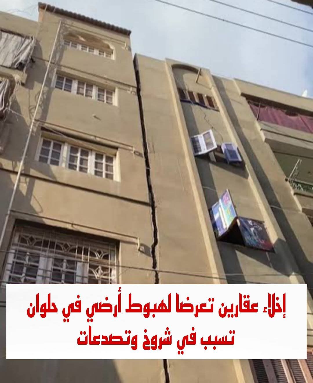 عااجل.. إخلاء عقارين بحلوان بسبب هبوط أرضي وظهور تصدعات في المبان